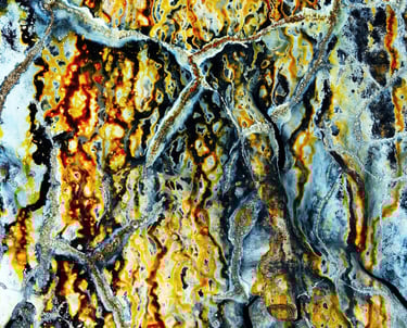 In den letzten Jahren habe ich mich auf das Studium der Höhlenwände konzentriert. Neben menschlichen Formen habe ich eine Serie von Mikrofotografien geschaffen, die die außergewöhnlichen Strukturen von Kalksteinformationen und Wasser zeigen. Durch das Zusammenspiel mit anderen Mineralien entstehen faszinierende Mosaike aus Formen und Farben.